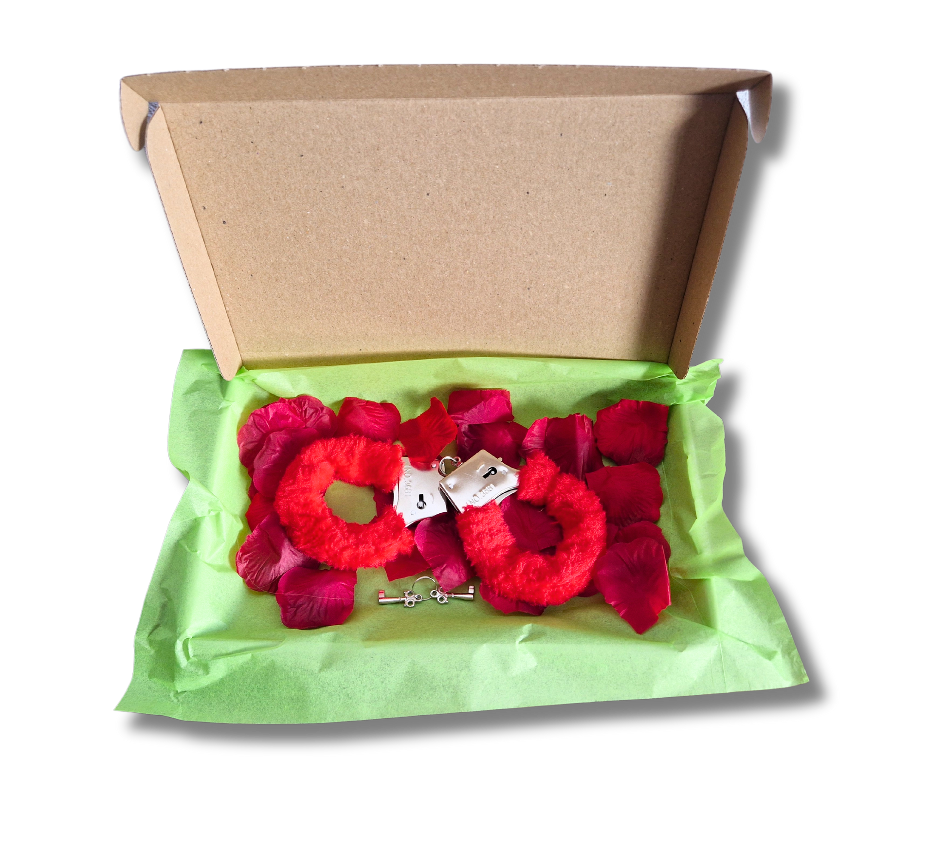 Je kunt er voor kiezen om een standaard, leeg pakket te versturen met alleen een persoonlijke boodschap. Maar je kunt er ook voor kiezen om het pakket nóg wat gênanter te maken, door deze te vullen met rozenblaadjes en handboeien.