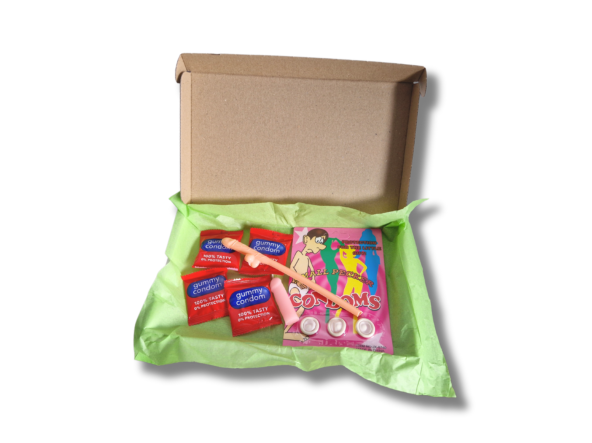 Je kunt er voor kiezen om een standaard, leeg pakket te versturen met alleen een persoonlijke boodschap. Maar je kunt er ook voor kiezen om het pakket nóg wat gênanter te maken, door deze te vullen met een kaars in een vorm van een condoom, condoomrietjes en een doosje XS-condooms (geen echte natuurlijk ;)).
